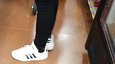 Candid voyeur gorgeous legs and ass in sunglass store